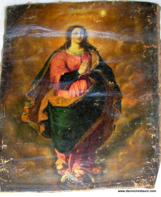 De un cliente particular también recibimos una obra que representaba una Virgen Inmaculada sobre un fondo de nubes. Tras unas catas de limpieza para la eliminar un grueso repinte, se descubrieron debajo de las nubes un coro de angelitos sobre un fondo en el que se puede apreciar un puerto marítimo.